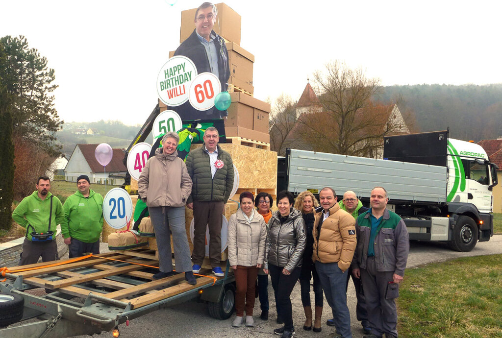 Geschäftsführer Willi Urschler feierte am Weltfrauentag seinen 60iger. Der über 4 m hohe Geburtstagsaufsteller wurde von einer Mitarbeiter-Delegation standesgemäß mit Kranwagen zugestellt.