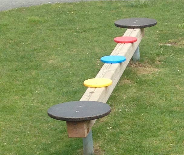- 1 Balancierbalken mit 5 runden Tellern