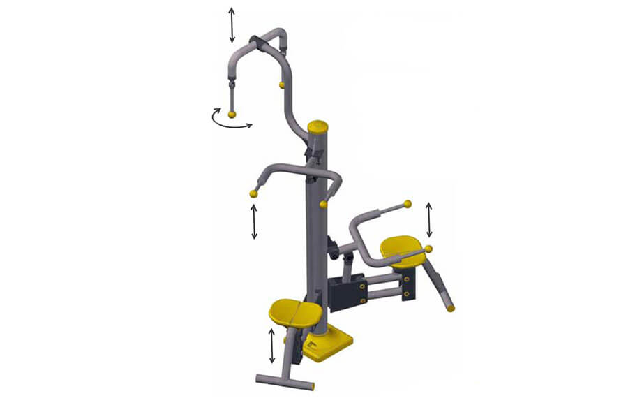 Übungen: Vertikalzug im Sitzen, Schulter- Nacken Trainer im Stehen, Trizepsstemme im Sitzen