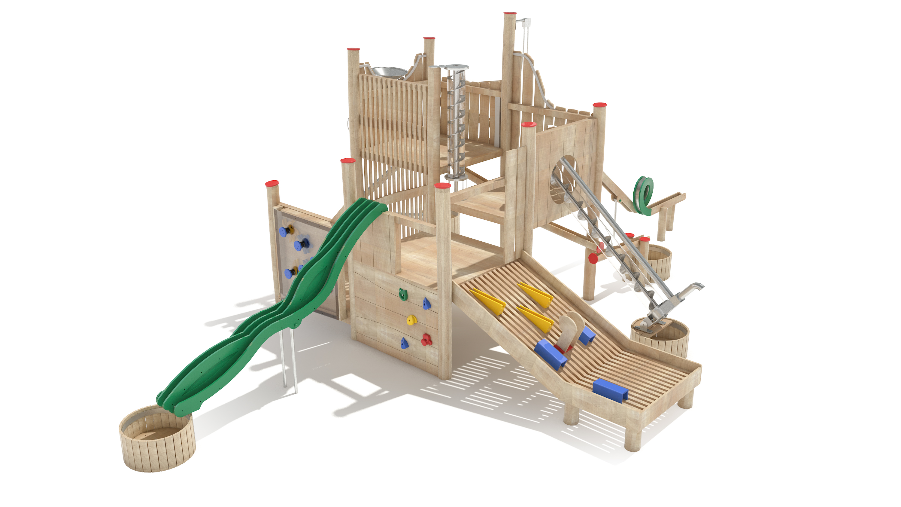 Unsere Holzbauteile werden kombiniert mit bunten polyethylen Platten unempfindlich gegen Feuchtigkeit und starker Beanspruchung. Die Platten gibt es in verschiedensten Farben von rot, blau und grün bis zu violett, pistazie und sandstein.